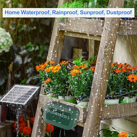- SOLAR AUTOMATIC WATERING SYSTEM - Powered by solar energy, and has the most power on the days water is needed most. This drip irrigation kit converts sunlight into electricity, and the built-in 2200mA high capacity rechargeable battery stores the power for daily watering use. Just prepare a big container of water, select the watering frequency with the number of drippers. Then go for a happy long vacation!
