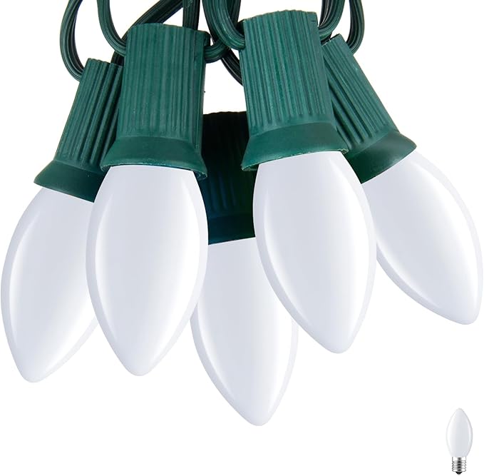 - C7 Vintage Christmas Lights : 25FT cool white outdoor Christmas hanging string Lights with 26 bulbs(1 spare), E12/C7 candelabra base, each bulb is 0.6W/120V, 2700K, cool white light emanates from the bulbs to create a retro and cheerful atmosphere, and it doesn't affect the other bulbs to light up if one bulb doesn't light up!