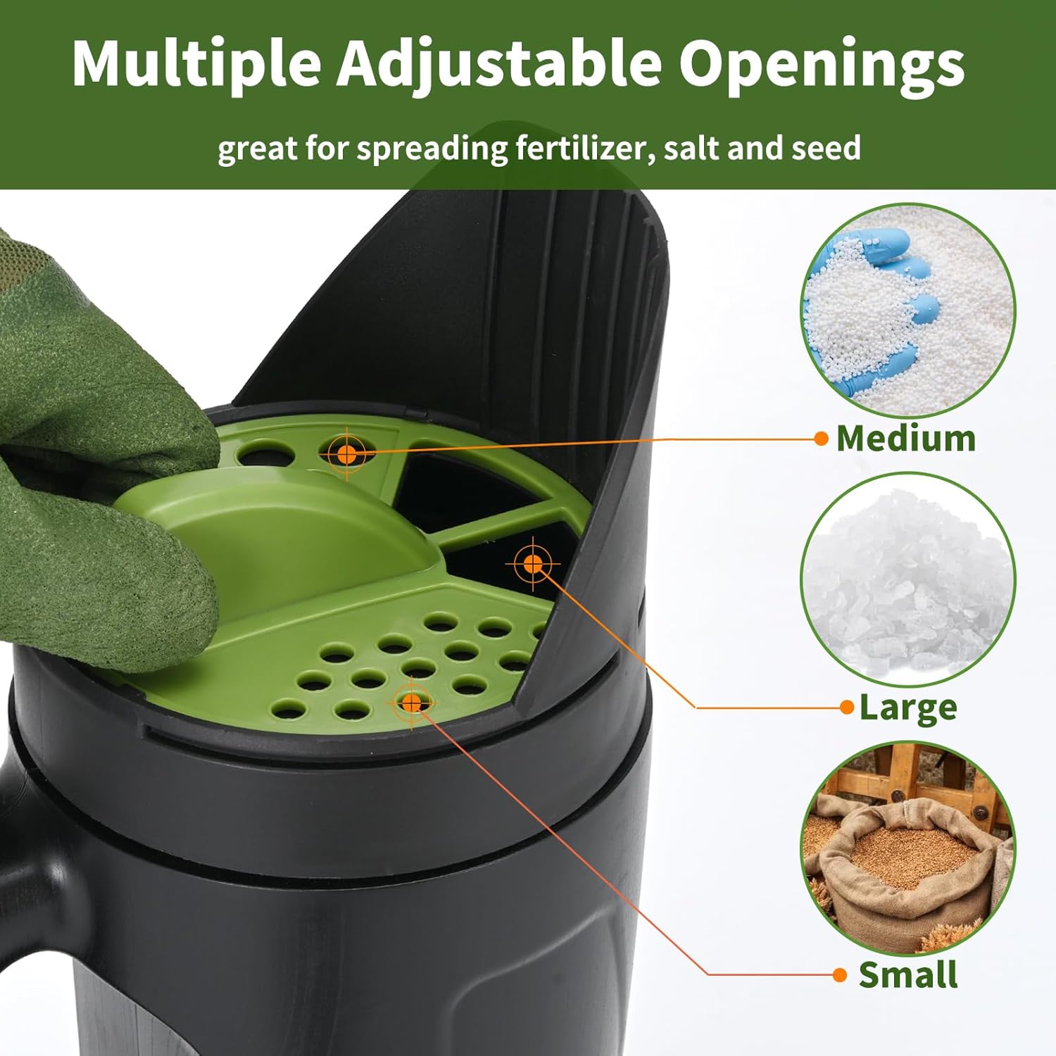 - Adjustable Openings : The grass seed spreader comes with garden gloves and adjustable openings in 3 different sizes for spreading different materials from coarse to fine.