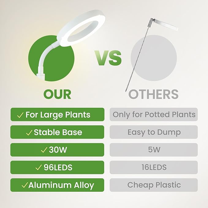 - Stable Base And Premium Material:Our upgraded enlarged and weighted base design provides more stable support and gives extra height to large plants. The aluminum shell ensures efficient heat dissipation, extending the light's lifespan