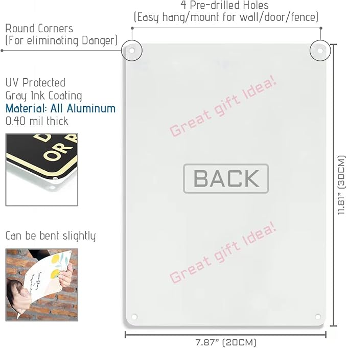 - Four Pre-drilled holes in the rounded corners for easy hanging or mounted on every surface, including walls, door, fence, poles and gates. Use with double-sided foam tape,command strips, jute rope or nails.