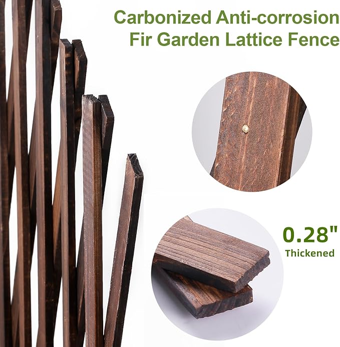 - 【STURDY AND DURABLE】: The expandable garden trellis has been treated with carbonization, Adopt Pine wood production, The grid-like design has better load-bearing capacity long lasting, Its flexible characteristics make it more widely used, such as garden fence, wall decoration, small animal fence, plant climbing frame.