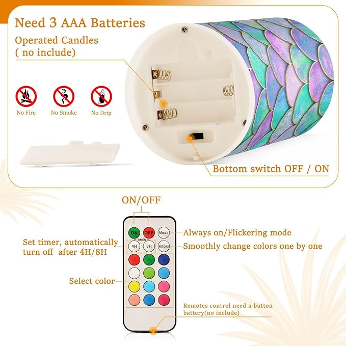 Vdsrup Flameless Candles Set of 2 Purple Teal LED Candles with Timer Battery Operated Mermaid Scale Candle Lights Flickering with Remote for Home Bedroom Decor