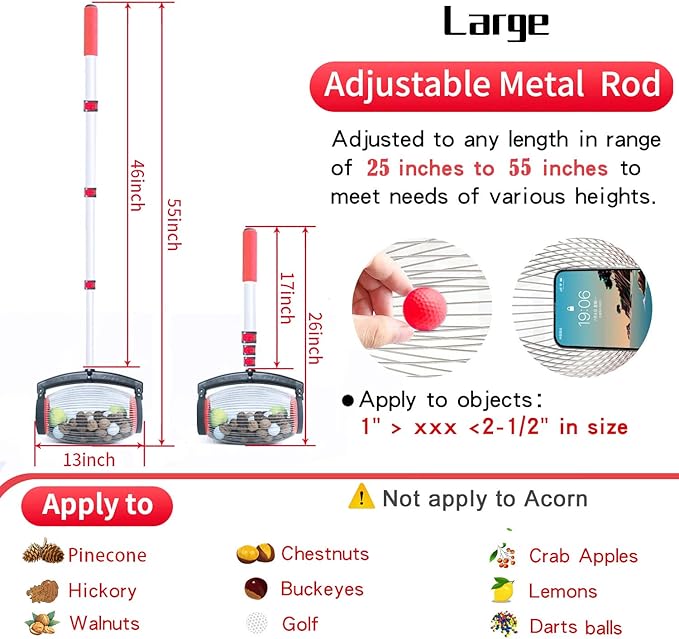 - 🌳【Widely Used】This one Capacity: 1.5 gallons. This one nut gatherer picks up objects 1’’ To 2-1/2’’ in sizes such as chestnuts, walnuts, pinecone, buckeyes, hickory nuts, nerf balls, golf balls, and even some small fruits such as lemons, limes, crab apple and more. Note: this one can't pick up acorns&sweet gum balls.