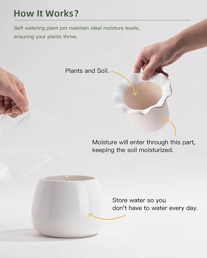 - TIMELESS DESIGN MEETS FUNCTIONALITY - Infuse your home with charm using our self-watering pots. The timeless design, coupled with advanced self-watering technology, creates a synergy of elegance and practicality. Ideal for plant enthusiasts