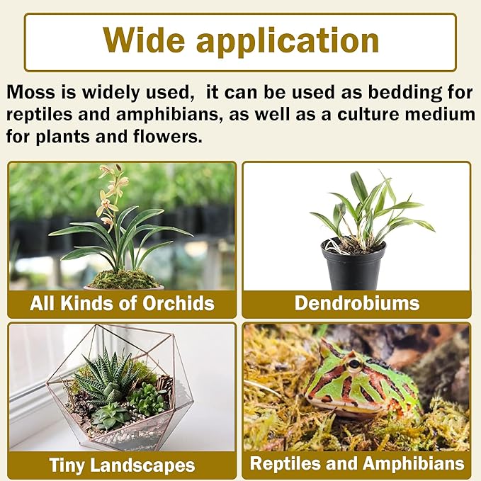 - Ideal Medium & Substrate: Sphagnum moss serves as an excellent nutrient source for orchids, ferns, and succulent plants, providing heat preservation, moisture, root protection, and promoting sprouting. It can also be utilized for succulent modeling, stuffing hanging basket liners, and decorative wreaths. Moreover, the moss can function as an egg-laying and incubation medium and can act as a substrate at the base of feeding boxes for reptiles and amphibians that require a certain level of humidit