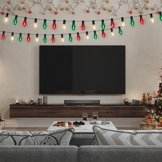 - Led Multicolor Christmas lights: C7 Led multicolor Christmas lights string outdoor with red/green/frosted white bulbs glow naturally warm, creating a vintage effect or antique atmosphere and romantic atmosphere. C7 led Red Green/White Christmas lights Perfect for wedding, birthday, Valentine's Day decoration and lighting.