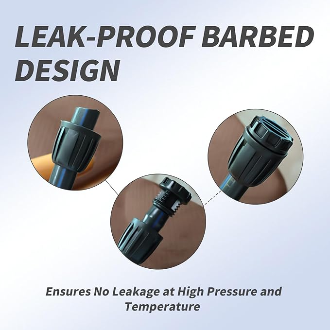- No Leakage, Secure Connection: Our irrigation hose connectors feature a lock fitting with a barbed design, ensuring that the tubing will not slip out or blow off even under high pressure and temperature conditions. Enjoy peace of mind knowing your irrigation system will operate efficiently without any leakage