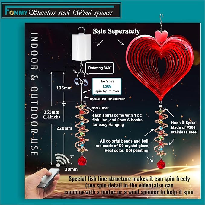 - 【PREMIUM CRYSTAL SUNCATCHER】The spiral with crystal is a special sun catcher rainbow maker, it’s Super Sparkly under sunshine. You can also add a motor(not include) to let the spiral to spin ,while spiral tail rotating (it can’t spin by itself.), the crystal ball seems to move up and down like floating and dancing in air, presents the magical visual illusion.