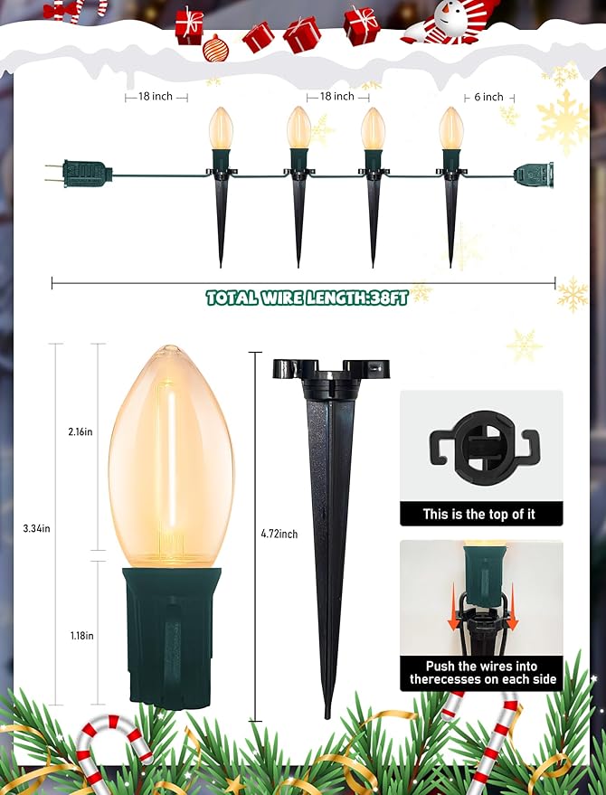 - Connectable Christmas Walkway Lights: Christmas decorations outdoor yard lights are easily installed with the equiped stakes, you can fix or place them anywhere necessary. total length 38 feet C9 outdoor christmas string lights with 25 c9 warm white led christmas stakes lights,18 inch lead with male plug, 18 inch spacing between C9 christmas path lights, 6 inch tail with female connector, c9 christmas pathway lights allowing you to add 28 strands (1064Ft) Christmas lawn lights outdoor optimize large area lighting, transforming your garden path into a festive wonderland.