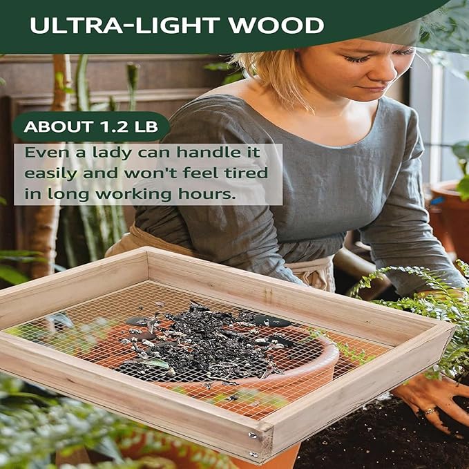 - 3.Ultra-light Wood-The weight of the soil sifter is 1.2lb, which means that most people can easily sift soil/dirt/sand/compost to a finer consistency. Even a lady can handle it easily and won't feel tired in long working hours.