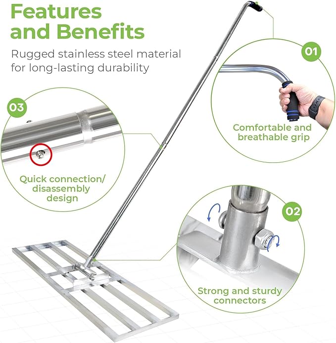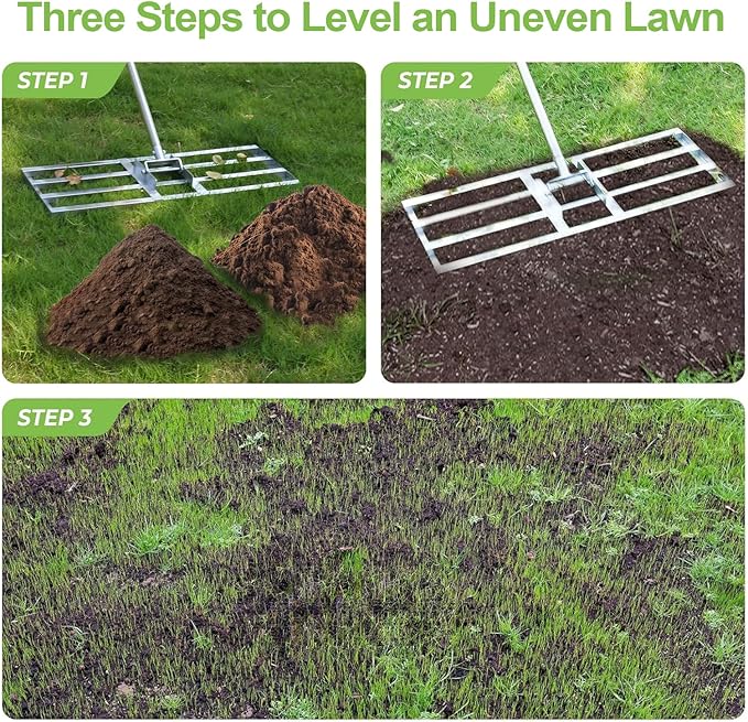 - Top-notch Material and Adjustable Length Pole:The leveling rake for grass is crafted from stainless steel.The pole's length can adjust based on your height and specific work needs, ensuring comfort and conformity to your usage preferences.Employing the tool in this way can alleviate back pain, thereby enhancing overall work efficiency.