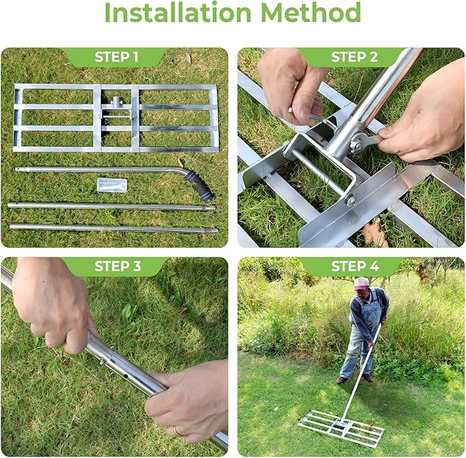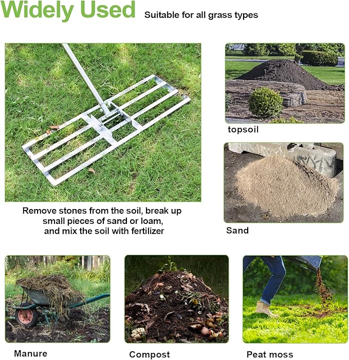 - Easy Setup and Use, Convenient Storage:The lawn leveler rake simplifies your task by avoiding snags or flipping on the lawn. It efficiently removes stones and breaks up small sand patches in the soil. The unique design allows easy installation within 1 minute, and after the job is done, it's effortlessly disassembled and stored compactly.