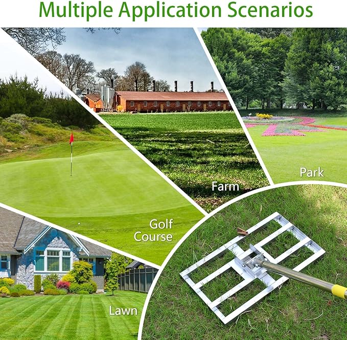 - Easy Setup and Use, Convenient Storage:The lawn leveler rake simplifies your task by avoiding snags or flipping on the lawn. It efficiently removes stones and breaks up small sand patches in the soil. The unique design allows easy installation within 1 minute, and after the job is done, it's effortlessly disassembled and stored compactly.