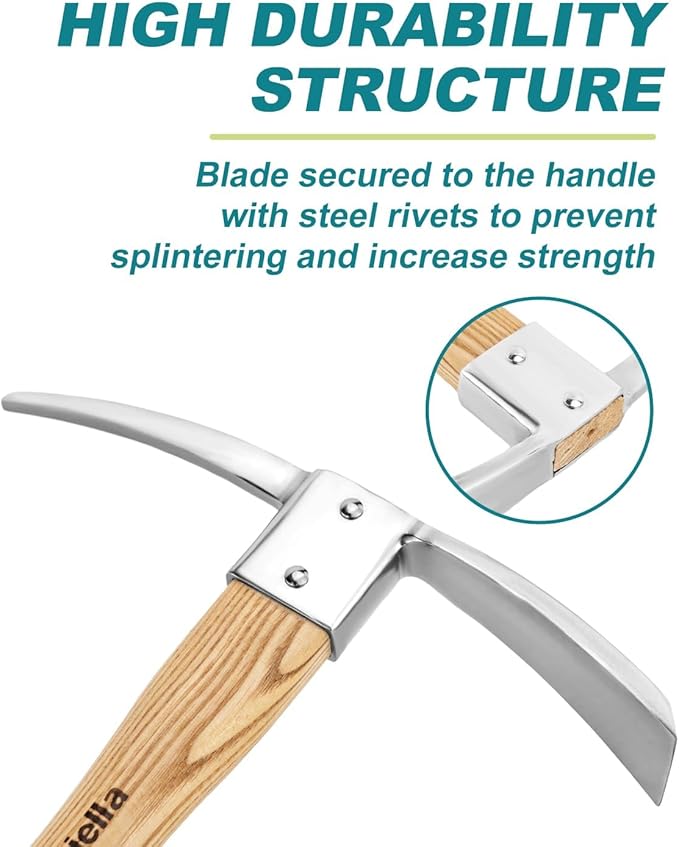 - 2-IN-1 HEAD DESIGN - The robust, shock absorbing ash handles and solid Steel head of this 2-in-1 tool allow you to switch quickly and efficiently from one type of cut to the next without breaking stride. The Hoe end is a heavy chopper edge that will bite into and loosen dirt and pull rocks, while the Axe side is great for cutting through roots, vines, and other gnarly materials. Great for serious garden work, and is ideal when wrestling with combinations of earth, roots, stumps, etc.