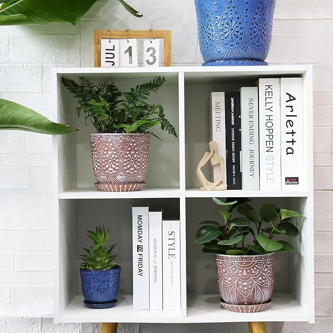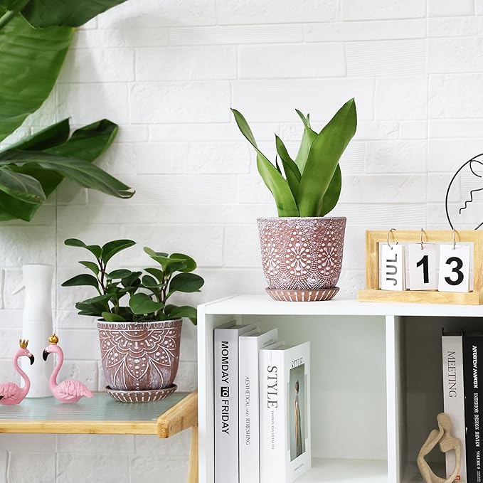 - 【Size & Package】:Pot Top Dia: 6 inch (can match a 5 inch inner pot), Pot H:5.15 inch; Saucer H:0.86 inch. Package: contains 2 ceramic flower pots, 2 ceramic saucers and 2 mesh pads(NOT INCLUDE PLANT)