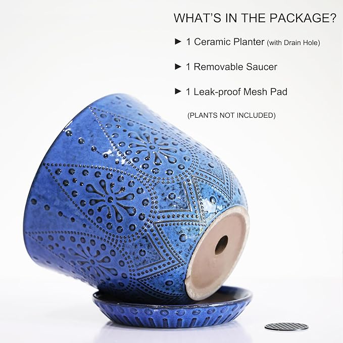 - Size & Package: 8.0 Inch Pot . Package: contains 1 ceramic flower pots, 1pcs mesh pads and 1pcs saucers(NOT INCLUDE PLANTS)