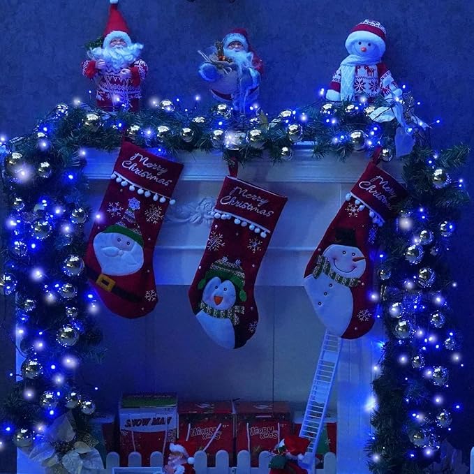 - Brilliant Outdoor Christmas Decor: 4 Pack each 100 LED starry-style solar christmas lights with blue and white light accent your space with a unique, inviting glow. Each lights with 33ft length is perfect to put around a garden or porch railing.Blue&White solar lights were the finishing touch for a back yard bbq, party, wreath, fence, patio, pools, bush, holiday, indoor, outdoor. In the dark, the wire fades to invisible, leaving only the fairy lights, create a classy and romantic atmosphere.
