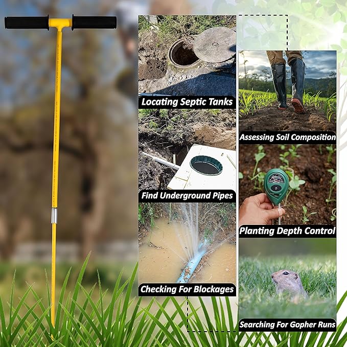 - Portable Design: The adjustable ground probe rod is lightweight and easily transportable, allowing users to transfer it to different areas without difficulty. While the insulation on the tool is designed to minimize the risk of electrical shock during checking soil condition and finding septic tank. This tool is not intended to take the place of your other personal protective equipment.