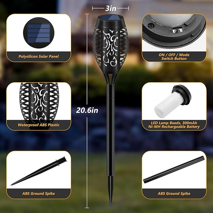 - 🔥【Waterproof & Durable Torches Outside】Solar flame lights outdoor waterproof are made of high-quality ABS plastics, No worries about rain, snow, frost and high-temperature. And notice that weather and winter will affect solar lights charging efficiency.