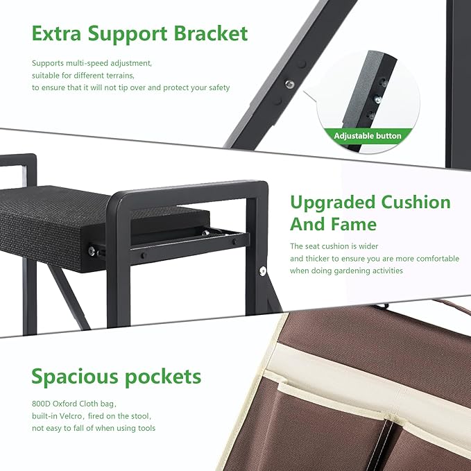 - GREAT GARDENING HELPER: The wider and thicker EVA cushion provides the most comfortable kneeling position for your gardening work. The included tool kit neatly organises your gardening tools. The kneeling stool flips over to become a sitting stool to ease your back pain!