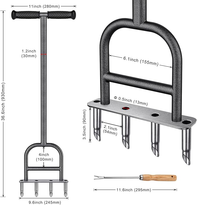 - Come with 12‘’ Weeder Handle Tool: Use this lawn coring aerator for other gardening tasks, Lawn aerators come with a 12’’ hand tool that you could use to clean the aerator. It can also be used for transplanting seedlings and weeding, which is very convenient.