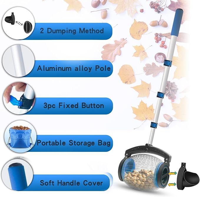 - 🏆【Which Features are better Others】①TWO Dumping Way,meet different needs. ②Telescopic rod with 3pc fixed button to fix height will be tighter, adjust high which perfectly matches people with different heights. ③Spherical basket connecting shaft widened - better scroll. ④Comfortable soft handle cover. ⑤A storage bag, you can use to store the collected nuts. ⑥Exquisite Gift box packaging can be given as a gift.
