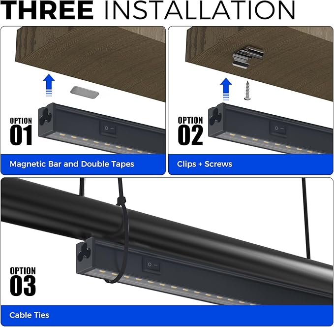- Easy Installation: With included clips, cable ties, magnetic bar with double-sided tapes, you could install this indoor plant light by yourself in minutes. Our under cabinet grow lights can be directly attached to any magnetic surface and any non-magnetic surface. Plug and play, and you could link up to 16 lights in a series, saving your time
