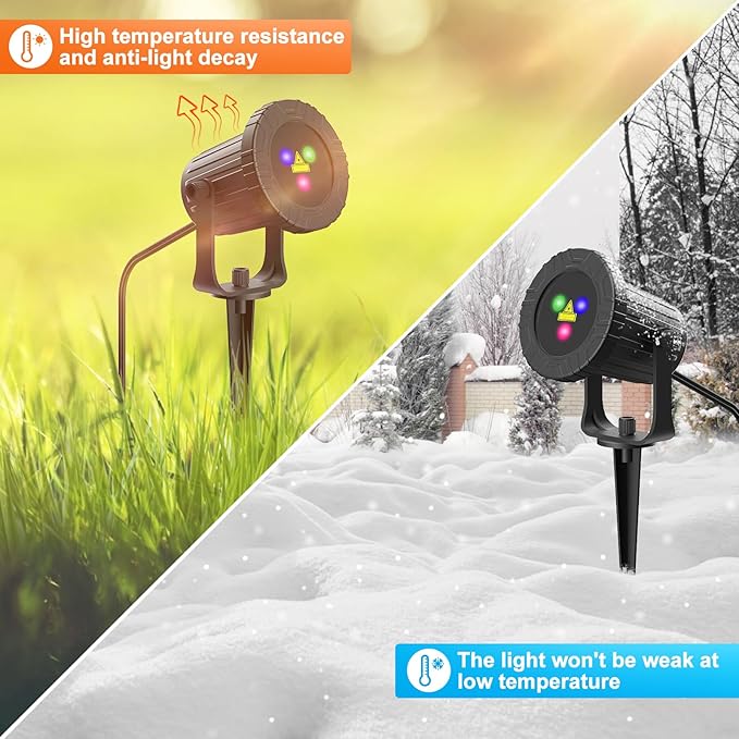 - 【Lights Up Instantly at Low Temperatures & the Light Won’t Be Weak】 This Christmas projector lights has leading low-temperature protection technology. It can light up instantly when connected to the power supply in a low-temperature environment, and the light will not be weak. However, other laser lights on the market will become weaker in low temperature weather or need to wait 5-10 minutes before they light up. With an IP65 waterproof rating, it's ideal for outdoor use as low as -31°F at Christmas.