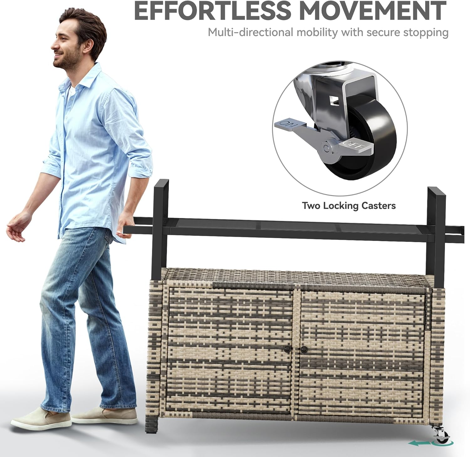 YITAHOME XL Outdoor Storage Cabinet, Outdoor Storage Cart with Wheels and Black Glass Table Top for Patio, Outdoor Cabinet for Poolside and Backyard (Gray Gradient)