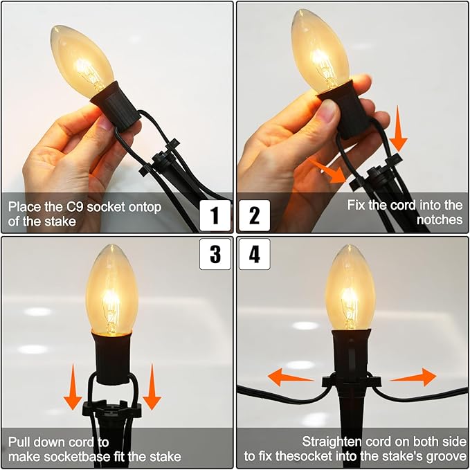 - OUTDOOR YARD PATH LIGHT: 38 feet C9 Christmas Path Lights have 27 clear incandescent bulbs (2 spare bulbs) and 25 stakes, each bulb 7W fits E17 base. The clear outdoor string lights emit a warm white glow, creating a warm and cozy Christmas atmosphere in your home.