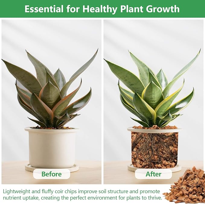 - Healthy Plants Growth: Our coco coir chips is an excellent mulch for indoor and outdoor plants, ensures adequate oxygen flow, improves soil nutrients and reduces weed growth; Good protection against harsh weather, frost protection to keep plants alive and thriving, ideal sustainable mulch for orchids and landscaping