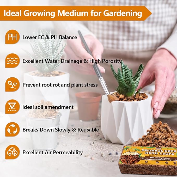- Wide Application: Coco chips are suitable for garden planting, indoor flower pots, potting mixes, raised garden beds, etc, promoting healthy root growth and rapidly expands the root system; Ideal for cacti, succulents, herbs, vegetables, microgreens and hoyas; It can also be used for reptile substrate and improve the living environment for pets