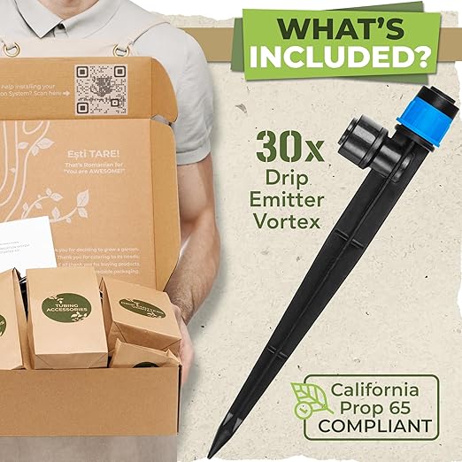 - Be a Gardening Master with our Push-to-Connect Drip Irrigation Emitters. The new and improved drip emitters set includes 30 Quick Connect Irrigation Emitters Vortex + 1 x Complete Instruction Guide Hard Copy. These irrigation drippers are ideal irrigation supplies for a drip irrigation system. Watch Your Plants Thrive with Carpathen's easy-to-install drip irrigation parts