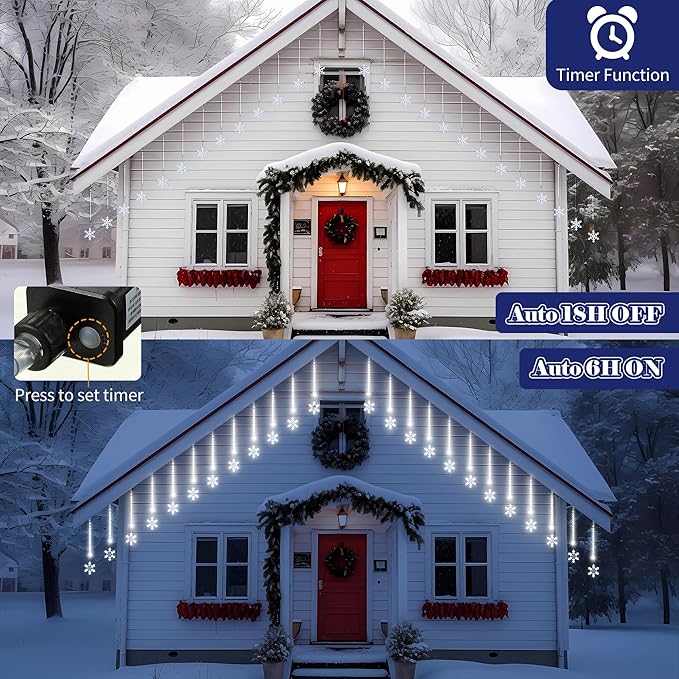- Timer Function: falling rain Christmas lights come with a timer on the power source, which makes it easier for you to turn it on and off less frequently; Once timed activated, the lights will be 6 hours on and 18 hours off per day