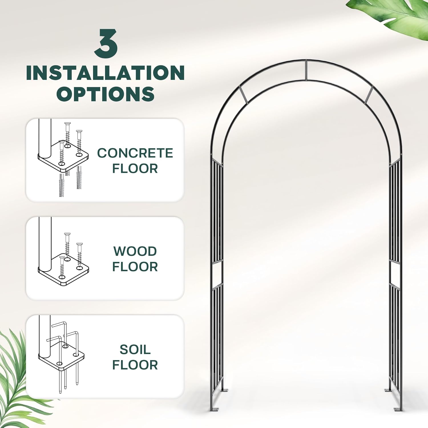 - THREE INSTALLATION OPTIONS: This versatile steel garden arbor trellis is designed to be easily installed on a variety of surfaces; Different bolts are included for easy installation in garden soil, on a wooden deck, or a solid concrete surface