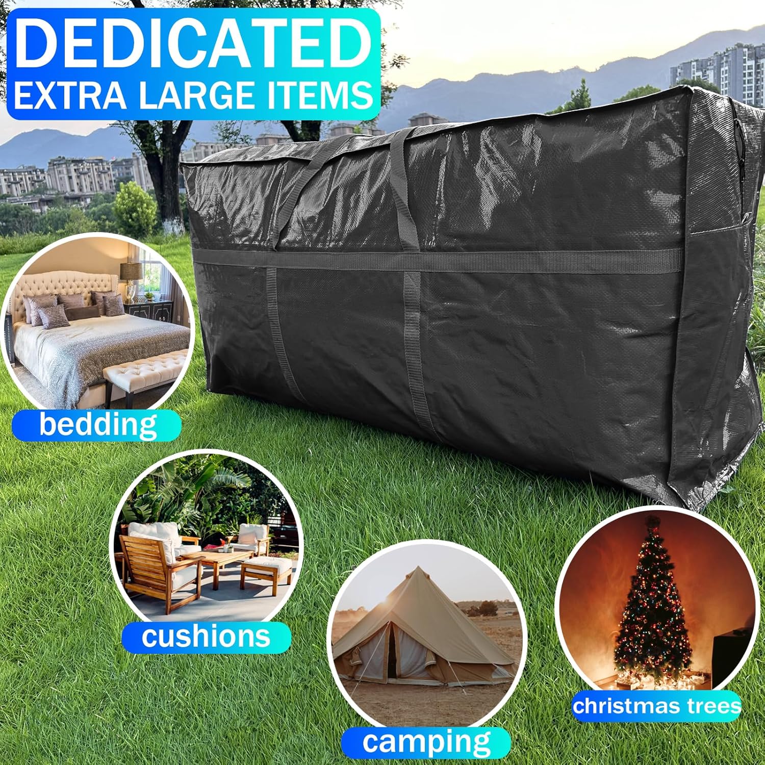 - MULTIPURPOSE: This extra large storage bags can serve so many purposes!! Used for moving, storing, transporting, camping, traveling, organizing, space saving etc. Great container to place clothes,quilts, pillows, christmas trees, decorations, bedding, sofa cushion, patio cushions, bed sheets, mops, vacuum cleaners, carpets and sports tools in during a residential move. Also suitable for garage, closet, basement storage and organizing camping equipment.