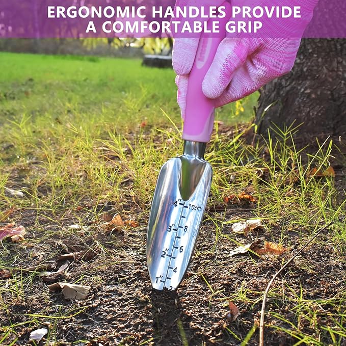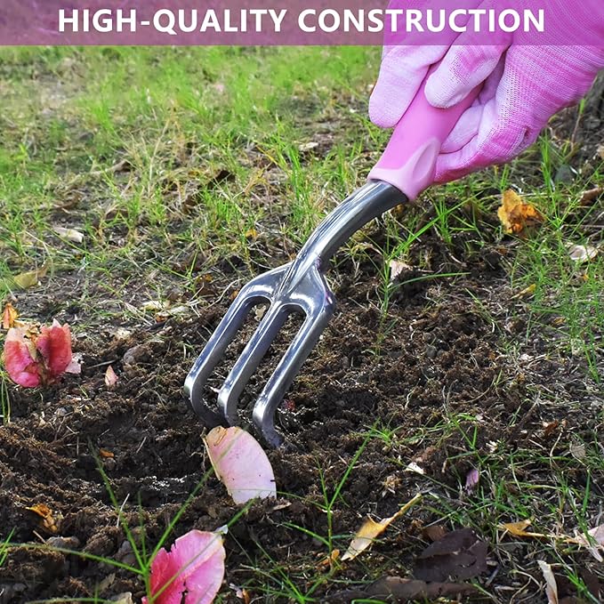 - HIGH-QUALITY CONSTRUCTION: Our gardening tools are made from durable materials and designed to withstand frequent use. The soft and ergonomic handles provide a comfortable grip, allowing for effortless gardening. This comprehensive set includes all the essential gardening tools for women, including a hand trowel, transplant trowel, garden rake, garden fork, garden weeder, crack weeder, and pruner.
