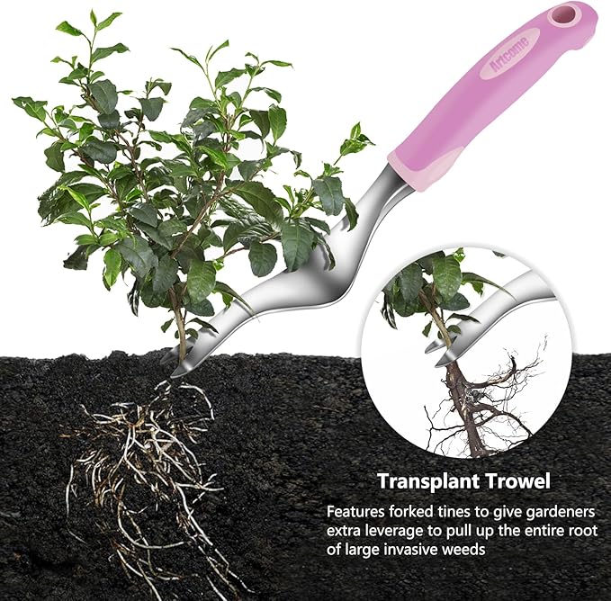 - STYLISH & UNIFIED DESIGN: The silicone handles of the hand trowel, transplant trowel, garden rake, garden fork, weeder, and weeding knife feature a beautiful pink color. The matching storage bag and gardening gloves also feature a warm pink color, making them perfect for women. This set adds a touch of elegance to gardening.
