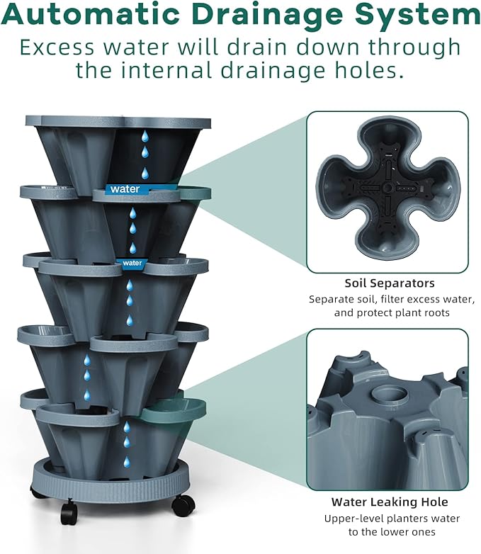 - Flow Design - The water filtration system from top to bottom can save water and retain moisture but prevents overwatering or root rot. 5 filters are placed on each level to keep the soil from going through the big drainage holes, it also helps retain water in each planter level.