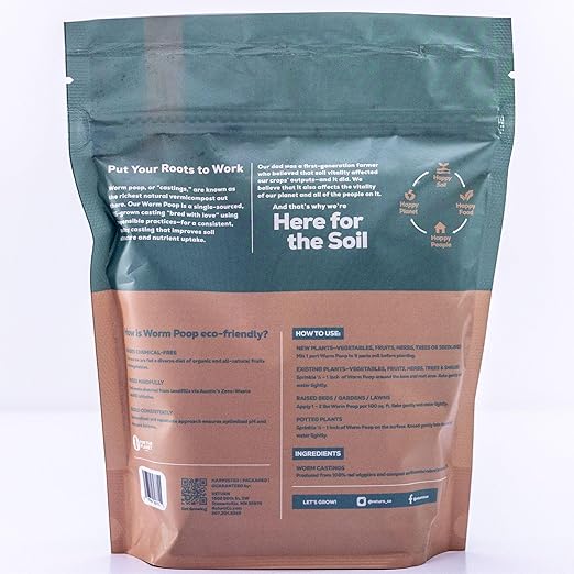 - Convenient 1-QT Pouches—Perfect for smaller gardening projects and smaller storage spaces. Slightly smaller than a cigar box, each pouch measures 7” x 9” x 2.5”. Can be used to amend two, 8-inch pots. Try our larger bag of Worm Poop Recipe #004 if you’re tackling a bigger gardening project.