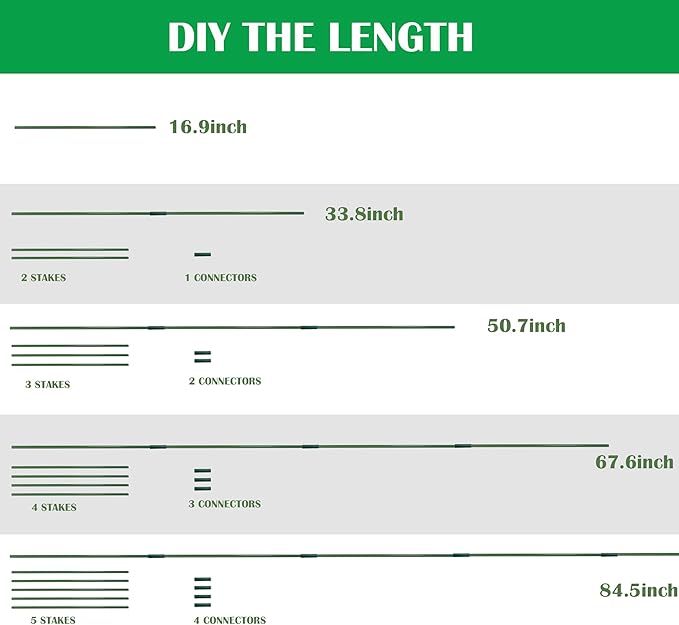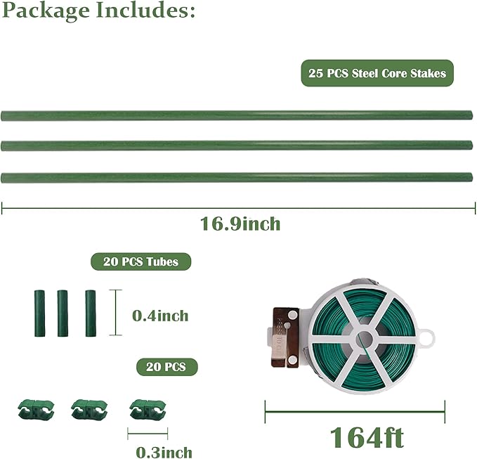 - PACKAGE INCLUDES: 50 Pcs 17" Plastic Stake, 40 Pcs Connecting pipe, 35 Pcs universal buckle and 164 Ft plant tie.