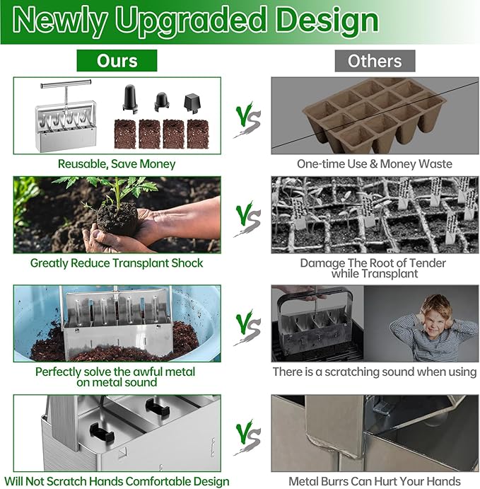 - 【Easy to Sow & Transplant for High Germination Rate】NVRGIUP soil block maker can makes four 2-inch cube design soil blocks at a time, protects the seed roots well to ensure even soil fill and complete seed transplanting. Our handle-type soil clod maker can increase air circulation, having healthier root system and easy for the plant acclimate to garden soil at transplant. Effectively prevent the roots from being pruned by air, transplant shock, stunting, slow growth.