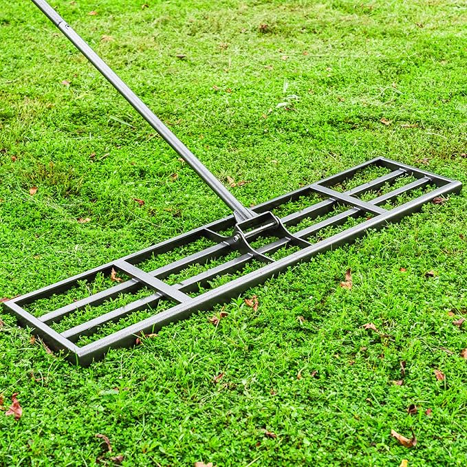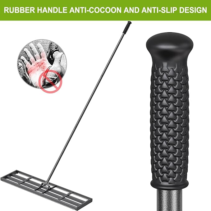 - ๐๐ข๐ ๐ก ๐ช๐ฎ๐๐ฅ๐ข๐ญ๐ฒ ๐ฆ๐๐ญ๐๐ซ๐ข๐๐ฅ: The main pole of level rake is made of 1.5mm thick steel pipe, very strong and not easy to deform or break, it comes with a 180ยฐ flexible rotating U-shaped head, anti-scratch powder coated finish, for faster, smoother lawn care.