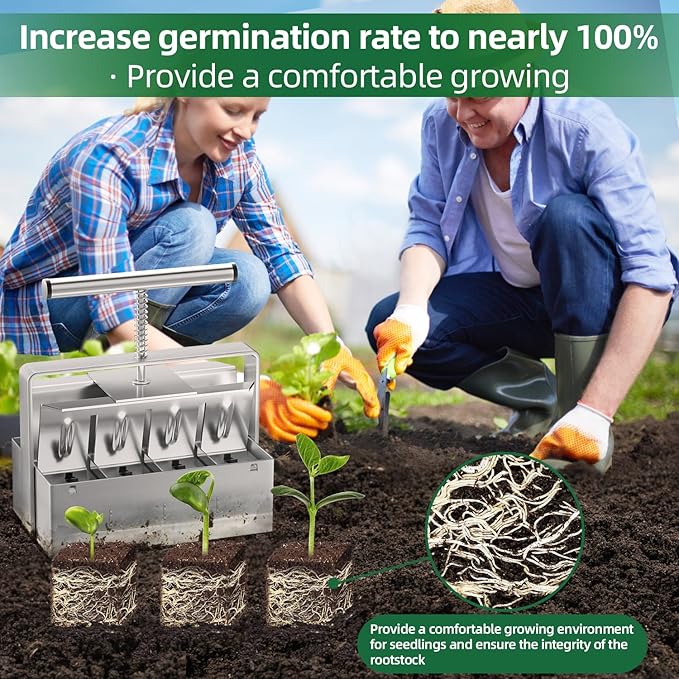 - 【No Transplant Shock, No Pot Needed Soil Blocking Tool】Our 8-cell soil block maker helps seeds grow on 2 inch soil blocks directly, minimizes damage to fragile root systems during transplanting and avoids root binding is the perfect eco-friendly replacement for plastic pots and cell trays, saving your money and energy. Durable rust-free material ensures easy cleaning and years of repeated usage, helping your seed starting without plastic waste or mess.