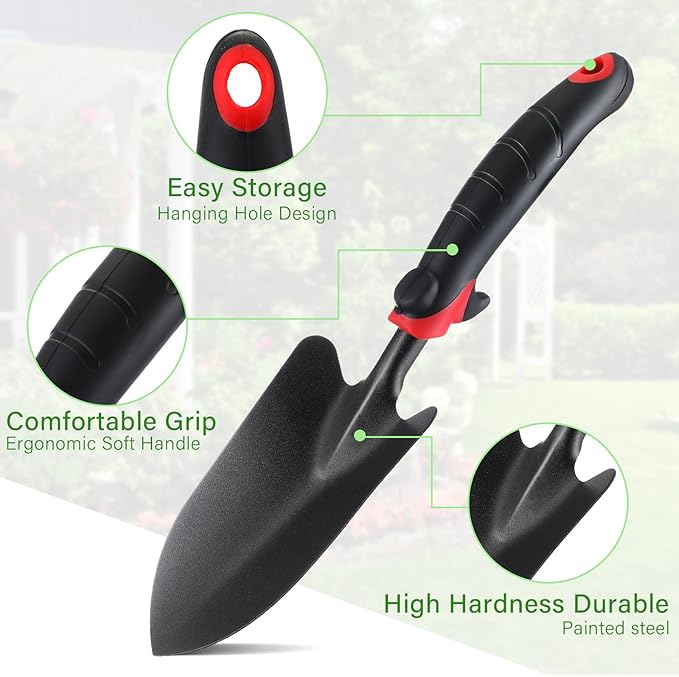 - User Friendly Designed Handles: say goodbye to hand fatigue with our scientifically designed handles of these gardening hand tools; They are concave and convex to fit both small and large hands comfortably; The handles are made from quality rubber material, which reduces wrist and hand strain; The practical hanging hole on each handle makes for easy storage