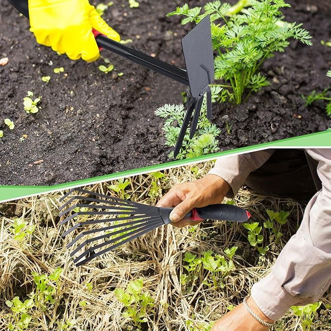 - Extensive Variety of Garden Tools: experience the convenience of having a variety of gardening tools and supplies you need in this set; We offer you 6 types of tools in twos: a narrow trowel, a wide trowel, a hand fork, a weeding hand rake, a dual purpose hoe, and a manual weeding knife; Such a set lets you engage in different garden tasks, from digging and loosening soil to aerating and transplanting
