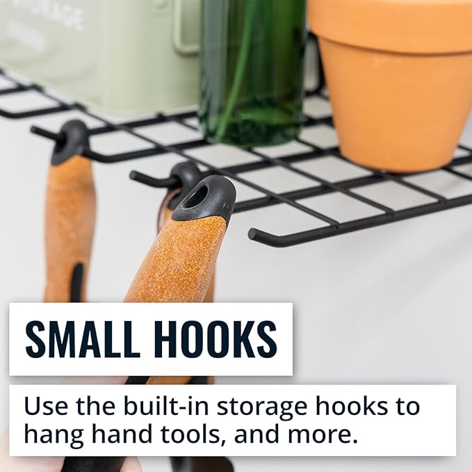 - GARDENING SUPPLIES STORAGE: The Afton Wall Organizer combines a rock-solid wall shelf and hanging hooks for storage of your outdoor tools and supplies. Perfect for your garden shed or garage.