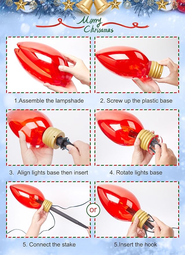 - Replaceable: Turn the outdside Christmas lights support on the base and pull out the internal light bulb from the outer super jumbo C9 bulb, screw out the damaged bulb from the bulb holder, then screw in a new one gently. Slide out the fuse chamber cover toward two blades and take out the burnt-out one, install the new one correctly and close the cover