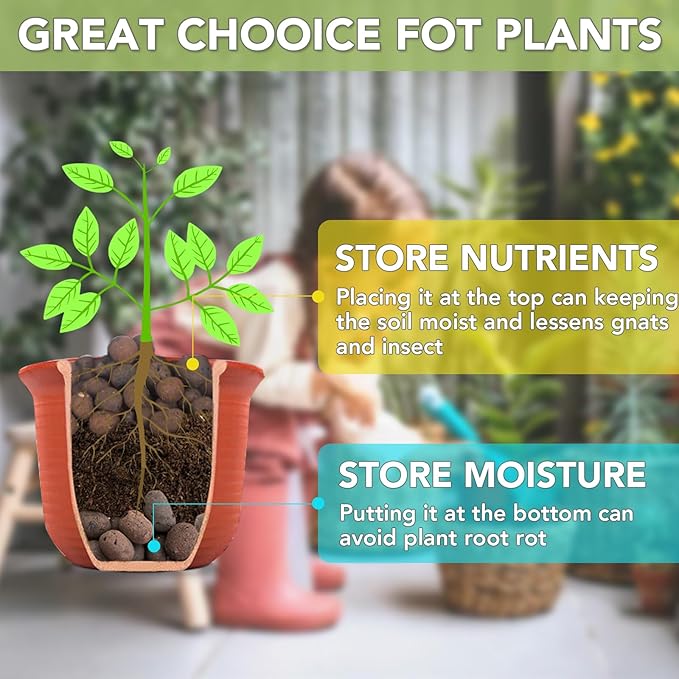 - 【EXCELLENT DRAINAGE】Expanded clay pebbles provide good drainage and water retention for plants.When clay pebbles are placed at the bottom of the pot, it prevents plant roots from rotting. Putting them on top not only keeps the soil wetting, but also can be used to decorate the plants.
